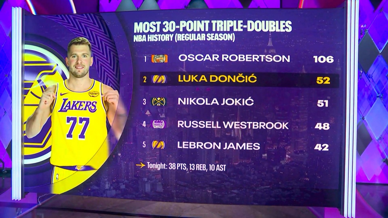 在今天湖人客胜掘金的比赛中,东契奇得到38分13篮板10助攻的大三双数据;据统计,这是他NBA生涯第52次30+得分的三双,超越约基奇,独居历史第二多。今天,老震带大家盘点一下,NBA历史30+得分三双榜。